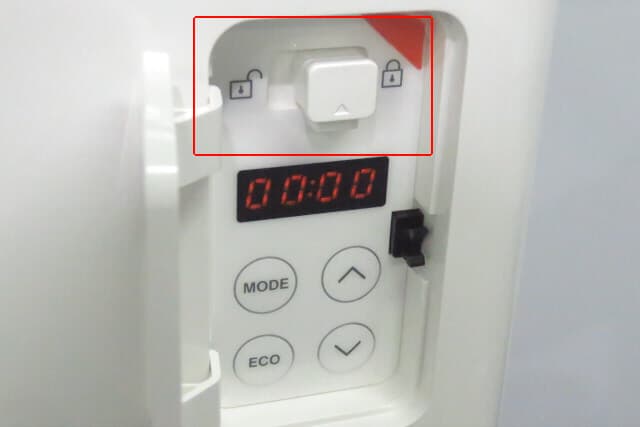 利用方法はとても簡単。チャイルドロックと同じように全面のふたを開くと、エコモードボタンがあります。